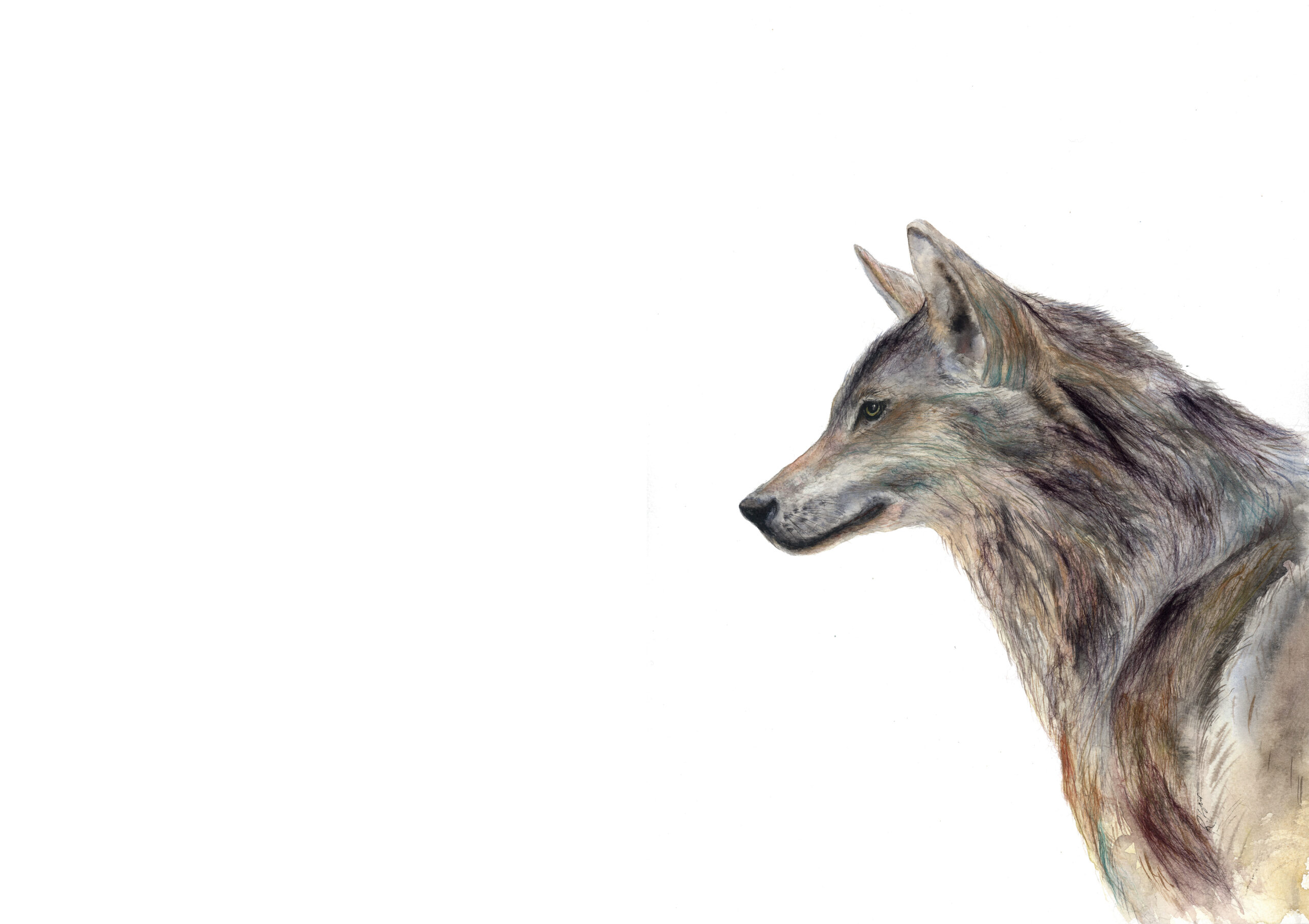 “Out There” a wolf painted in watercolour, with merino-wool and silk fibres. This original painting comes mounted in blue-grey and is framed in a beautiful silver-grey frame.